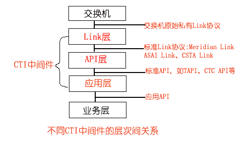 在Link層的基礎(chǔ)上,實(shí)現(xiàn)把標(biāo)準(zhǔn)Link協(xié)議轉(zhuǎn)化為標(biāo)準(zhǔn)的API,如CTC API、TAPI、JTAPI等,為CTI應(yīng)用開發(fā)提供一套標(biāo)準(zhǔn)的API,屏蔽了不同交換機(jī)擁有的CTI協(xié)議和CTI接口,使應(yīng)用程序員無需關(guān)心消息是如何在計(jì)算機(jī)和交換機(jī)之間傳遞,專注于客戶端的應(yīng)用開發(fā),實(shí)現(xiàn)應(yīng)用程序與交換機(jī)平臺(tái)無關(guān)性。