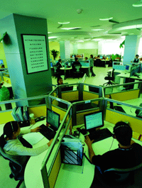 “目前這里每天要處理2000多個(gè)電話,一個(gè)月的電話量累計(jì)高達(dá)8萬個(gè)。每個(gè)坐席代表平均每天處理電話60次左右!彼上码娖鳎ㄖ袊┯邢薰矩(fù)責(zé)呼叫中心營運(yùn)的CRM推進(jìn)部副部長陳文凱說,“這是一個(gè)不輕松的工作崗位,因此,坐席代表的工作環(huán)境和工作待遇得首先得到保證。只有讓他們心情愉快,他們才能笑著去服務(wù)客戶!边@個(gè)寬敞舒適的工作大廳,就是基于這樣的思路設(shè)計(jì)出來的。每個(gè)坐席代表置身于扇形柔色的工作空間內(nèi),既能精力集中,又能避免回復(fù)電話的聲音互相干擾,一定角度的扇形空間發(fā)揮了最大的吸音效果。在大廳旁邊,還專設(shè)坐席代表休息室,每工作2小時(shí)后,他們可以到休息室休息一會(huì)。