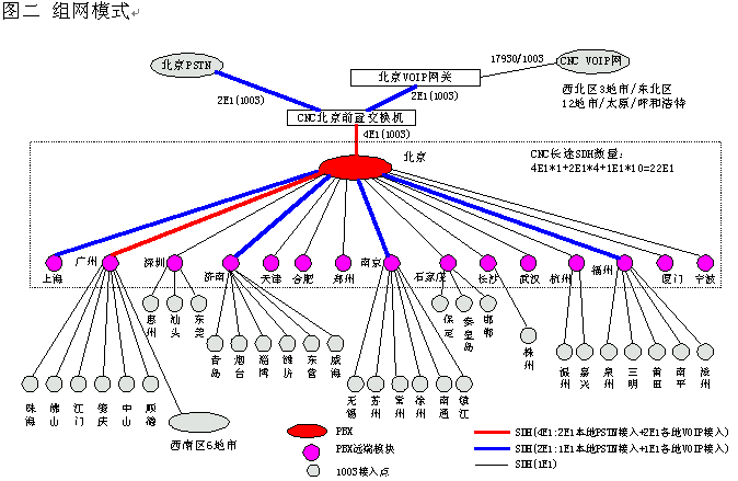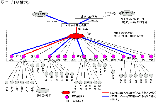 網(wǎng)通的客戶服務(wù)系統(tǒng)(1003呼叫中心)包括位于北京總部的總中心及其它全國(guó)30多個(gè)城市的分中心,全國(guó)范圍共有近200個(gè)接入點(diǎn)(覆蓋城市),共有200余座席,由總中心,交換機(jī)遠(yuǎn)端模塊接入點(diǎn)子中心及軟覆蓋接入點(diǎn)組成的三層架構(gòu)。參見(jiàn)下圖一《系統(tǒng)架構(gòu)》及圖二《組網(wǎng)模式》。