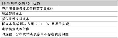 為盡量縮減成本,企業(yè)主管們都在想方設(shè)法引入新型通信技術(shù)改造呼叫中心。IP呼叫中心的ROI優(yōu)勢(shì)在于:應(yīng)用服務(wù)器與技術(shù)管理高度集成化;縮減管理成本;減少技術(shù)支撐成本;低成本集成解決方案(CTI),且易于實(shí)現(xiàn);電話裝置成本低廉;對(duì)遠(yuǎn)程、分布式站點(diǎn)及家用不存在費(fèi)用問(wèn)題。