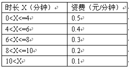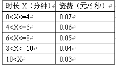例3,國(guó)內(nèi)長(zhǎng)途話費(fèi)在時(shí)長(zhǎng)不超過(guò)4分鐘的情況下,按0.07元/6秒收取;超過(guò)4分鐘但不超過(guò)6分鐘,統(tǒng)一按0.06元/6秒收;超過(guò)6分鐘但不超過(guò)8分鐘,統(tǒng)一按0.05元/6秒收。怀^(guò)8分鐘但不超過(guò)10分鐘,統(tǒng)一按0.04元/6秒收。怀^(guò)10分鐘,統(tǒng)一按0.03元/6秒收取。