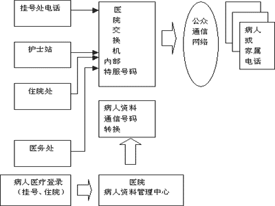 病人資料數(shù)據(jù)庫保存的病人資料均與病人住院、就診代號對應,醫(yī)護人員因工作需要欲與病人或家屬聯(lián)系時,使用本部門的電話通過呼叫中心獲得使用權限。交換機給醫(yī)院內(nèi)部指定一個"特服號碼",負責與病人通信。