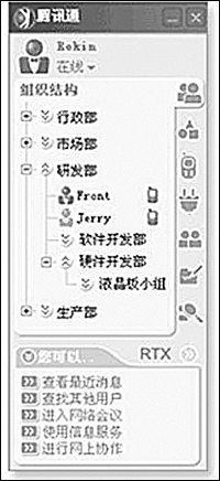 與其他應(yīng)用程序集成是EIM的發(fā)展趨勢,也是企業(yè)現(xiàn)代辦公的一大需求。目前,騰訊通RTX已成功與國內(nèi)著名的金碟、用友、北京慧點(diǎn)等軟件廠商開展合作,使騰訊通RTX的整體功能進(jìn)一步提升,極大地方便了企業(yè)應(yīng)用。比如通過與金碟OA的集成,實(shí)現(xiàn)了企業(yè)級實(shí)時通信平臺與企業(yè)管理軟件和信息化解決方案的緊密結(jié)合,從而更好地滿足客戶需求。通過與用友ERP集成,降低了企業(yè)通信時間和費(fèi)用,提高了工作效率。