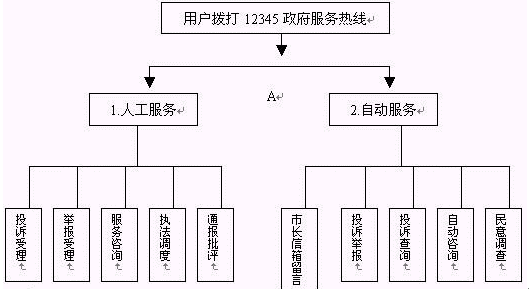 當(dāng)用戶撥通"12345"電話并選擇自動(dòng)服務(wù)時(shí),聲訊臺(tái)自動(dòng)播放引導(dǎo)語"選擇市長信箱留言請按1,自動(dòng)投訴舉報(bào)請按2,投訴查詢請按3,服務(wù)咨詢請按4,民意調(diào)查請按5。