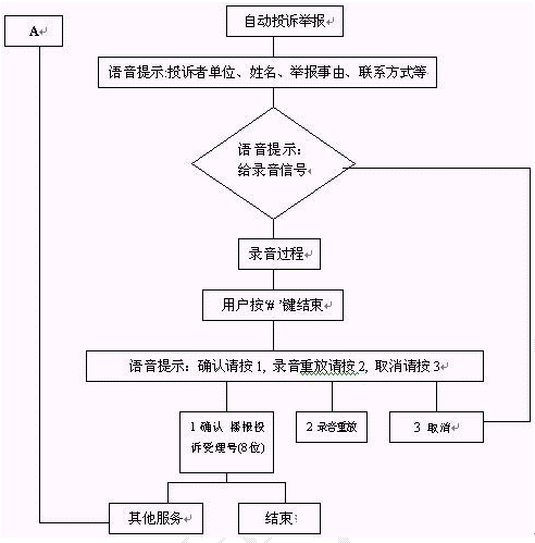 群眾通過自動(dòng)臺(tái)按照語音提示進(jìn)行投訴、舉報(bào)選擇錄音。自動(dòng)投訴舉報(bào)錄音流程如下: