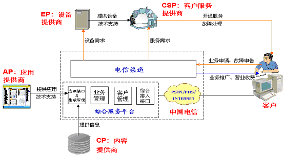 商務領航業(yè)務由中國電信和AP(應用提供商)、EP(設備提供商)、CSP(客戶服務提供商)、CP(內(nèi)容提供商)合作運營。合作伙伴的分工和服務流程如下圖所示。