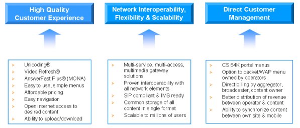 雖然視頻和多媒體服務(wù)的突然火熱對(duì)消費(fèi)者、企業(yè)和業(yè)界來(lái)說(shuō)都是件好事,但存在的挑戰(zhàn)還是很多,如怎樣提供高質(zhì)量的用戶體驗(yàn)、解決手機(jī)和網(wǎng)絡(luò)可互操作性問題,以及集成商、廣播媒體和內(nèi)容提供商的直接用戶接觸與管理問題。這些問題的主要技術(shù)解決方案提供者有Unicoding®、Video Refresh®和AnswerFast Plus® (MONA的一部分),同時(shí)多媒體網(wǎng)關(guān)解決方案也包括在內(nèi)。其它方面的可互操作性和用戶體驗(yàn)改善問題很容易能解決,對(duì)今天現(xiàn)有的WAP服務(wù)是一種補(bǔ)充。