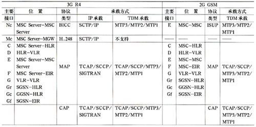 以下首先對(duì)3G R4核心網(wǎng)與2G GSM核心網(wǎng)中的主要接口與協(xié)議進(jìn)行列舉、比較,如表1所示。