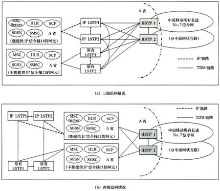 該種方案情況下,省內(nèi)支持IP信令的網(wǎng)元直接與IP LSTP相連(兩級(jí)組網(wǎng)情況下還需要通過TDM方式與現(xiàn)有HSTP相連),不支持IP信令的網(wǎng)元仍保持原有連接方式與現(xiàn)有LSTP相連(兩級(jí)組網(wǎng)情況下還要與HSTP)。省際信令消息仍由現(xiàn)有長(zhǎng)途No.7信令網(wǎng)疏通,省內(nèi)信令由LSTP疏通。
