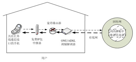 免費IP包業(yè)務的最大特點就是,有線寬帶接入向手機用戶提供了免費寬帶接入服務環(huán)境,這是通過在網(wǎng)中引入寬帶接入與手機的中繼設(shè)備而實現(xiàn)的,他們把該設(shè)備稱作免費IP包傳輸中繼器,該中繼器可以說小巧玲瓏,它約10公分見方、高不足3公分,重量也僅有80克。在中繼器內(nèi)裝載了μITRON4.0標準的實時操作系統(tǒng),并具有紅外線通信接口(符合IrDAver.1.2標準,最高速率為115.2kbit/s)和以太網(wǎng)接口(10/100Mbit/s),具有紅外線通信接口的手機(NTT DoCoMo公司網(wǎng)里現(xiàn)有這類手機共37種),通過無線方式與免費IP包傳輸中繼器相連,免費IP包傳輸中繼器通過以太網(wǎng)經(jīng)過寬帶路由器或通過PPPoE(Point to Point Protocol over Ethernet)方式連接到ONU或ADSL的調(diào)制解調(diào)器上,手機通過有線寬帶接入網(wǎng)與采用TCP/IP協(xié)議的因特網(wǎng)就連接起來了,這樣手機用戶就可去享受免費IP包服務。