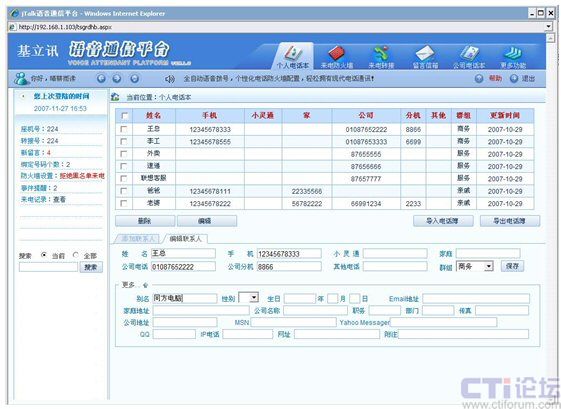 該功能有效方便了企業(yè)員工可以做到一個電話本,企業(yè)內(nèi)部、外部都能使用的需求。    員工使用電話留言功能可以讓來電者為自己留言。來電者留言后,員工可以通過電話或者網(wǎng)頁聽取留言。該功能有效方便員工特別是管理人員在忙時只處理重要電話,而將次重要電話做留言處理以便日后空閑時處理。員工可以遠(yuǎn)端或者本地管理留言。    電話本查詢功能允許員工從任何一臺電話機(jī)(企業(yè)內(nèi)部或者外部電話都可以)查詢自己的電話本中聯(lián)系人信息。該功能對于出差在外管理人員,緊急時如果要查詢某客戶資料信息特別有用。例如,可以查詢客戶姓名、電話號碼、地址等等。    電話監(jiān)控錄音功能允許企業(yè)對來電進(jìn)行有選擇或全部的監(jiān)控錄音。錄音文件按格式分日期歸擋,方便企業(yè)隨時查詢。該功能有效保護(hù)企業(yè)的合法權(quán)益,避免因為客戶服務(wù)質(zhì)量或其他原因造成的可能投訴,并能夠?qū)ζ髽I(yè)員工或者績效考核提供依據(jù)。