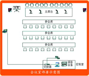中大型會(huì)議室約在150~250平米,一般為教室型布局,即主要人員和領(lǐng)導(dǎo)在主席臺就座,參會(huì)人員在臺下就坐,這種情況的布局和設(shè)備放置的情況如圖所示。