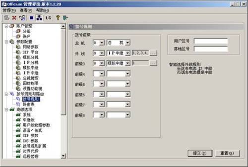 IP PBX 進(jìn)行配置(如圖)。人機(jī)界面簡(jiǎn)潔易懂,即便是不懂通訊的外行人,在看過說明書后也能輕松自如地使用。配置起來簡(jiǎn)單,例如選擇外線撥號(hào)前綴號(hào)、做呼叫中心時(shí)的ACD輪循分機(jī)線路輪循、回?fù)艿,僅僅選下數(shù)字點(diǎn)下提交,幾秒內(nèi)就可配置結(jié)束。
