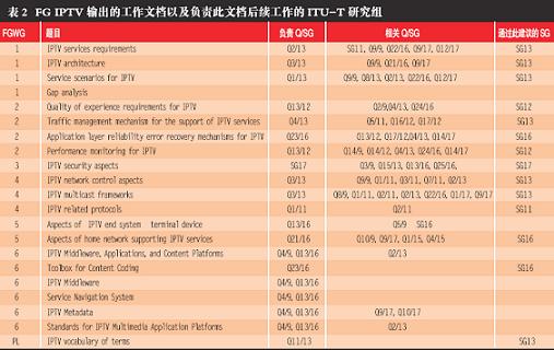 表2 FG IPTV 輸出的工作文檔以及負(fù)責(zé)此文檔后續(xù)工作的ITU-T 研究組