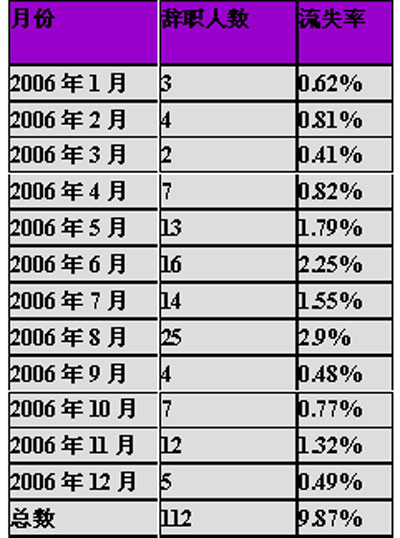 在進(jìn)行收集、分析一些客服中心資料的過程中,與相關(guān)領(lǐng)導(dǎo)人員進(jìn)行較深入的思想碰撞,尤其是與中國移動江蘇省客服中心副總經(jīng)理張立春的交流,尤為深刻。一組數(shù)據(jù)深深的震撼著我的思想,一是離職率2006年,僅為:9.87%,遠(yuǎn)遠(yuǎn)好于整個行業(yè)的平均水平;二是員工的心理健康和壓力狀況遠(yuǎn)遠(yuǎn)好于全國的平均水平;三是客戶服務(wù)質(zhì)量保持行業(yè)領(lǐng)先地位,各項指標(biāo)具體數(shù)值陳述如下。