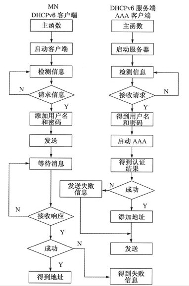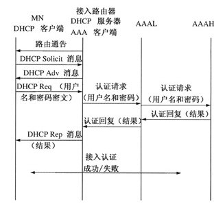 本方案認證機制在比較上述幾種認證機制的優(yōu)缺點的基礎(chǔ)上,根據(jù)層次移動IPv6的網(wǎng)絡(luò)特性和運行需求,采用IPv6的動態(tài)主機配置協(xié)議(DHCPv6)結(jié)合AAA協(xié)議來完成AAA認證和地址分配過程。該機制工作在網(wǎng)絡(luò)層,不依賴鏈路層協(xié)議,有利于移動節(jié)點用多種方式接入網(wǎng)絡(luò),具有兼容性好、利于向高層協(xié)議擴展、實現(xiàn)簡單、容易控制、與移動IP結(jié)合性好等優(yōu)點。