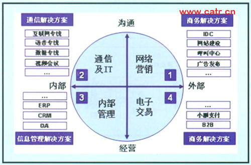 企業(yè)客戶(hù)對(duì)電信服務(wù)的需求,集中體現(xiàn)為實(shí)現(xiàn)企業(yè)商業(yè)過(guò)程的綜合通信信息整體服務(wù),具體可以按縱向溝通、經(jīng)營(yíng)和橫向內(nèi)部、外部分為四部分:內(nèi)部員工溝通、內(nèi)部經(jīng)營(yíng)管理、外部客戶(hù)營(yíng)銷(xiāo)以及產(chǎn)品銷(xiāo)售實(shí)現(xiàn)。與之相對(duì)應(yīng)的需求如圖2所示。