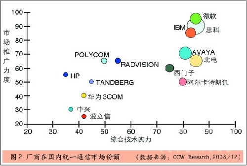 從當(dāng)前國內(nèi)統(tǒng)一通信市場(chǎng)競爭格局來看,在綜合技術(shù)實(shí)力方面,根據(jù)廠商所提供的統(tǒng)一通信解決方案中所能夠提供的各種溝通方式融合的程度以及每個(gè)具體功能技術(shù)水平等綜合因素考慮,處于前幾位的分別是思科、微軟、北電、IBM和Avaya,它們的產(chǎn)品線比較長,產(chǎn)品功能也相對(duì)比較全面。
