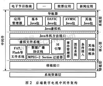 系統(tǒng)層為上層具體應(yīng)用的執(zhí)行提供基于Java的運行環(huán)境。這層主要包括3部分:Java虛擬機、應(yīng)用管理器和符合中間件標(biāo)準(zhǔn)的應(yīng)用編程接口(API)集。Java虛擬機負責(zé)解釋和執(zhí)行。lavaTM語言。應(yīng)用管理器負責(zé)管理應(yīng)用的生命周期。API集除了包括與MHP兼容的部分包,比如基本的Java包,DAVIC包外,還對國家中間件標(biāo)準(zhǔn)作了部分的擴展。