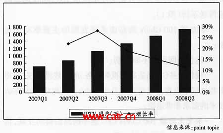 Play業(yè)務,AT&T、Verizon等電信運營商也積極開展IPTV業(yè)務,并且用戶規(guī)模迅速增長,截至2008年第二季度,美國的IPTV用戶達到249萬。亞太各個國家和地區(qū)的IPTV業(yè)務發(fā)展情況差異很大,中國香港的PCCW是目前IPTV用戶規(guī)模最大的電信運營商,截至2008年第二季度,PCCW的IPTV業(yè)務“now