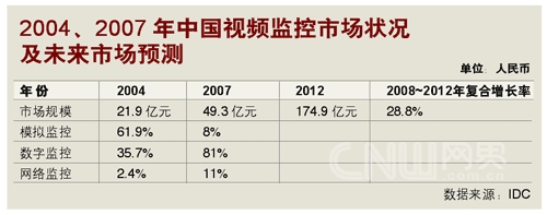 IDC的數(shù)字同樣樂(lè)觀。跟據(jù)IDC在2008年的預(yù)測(cè),2008~2012年,中國(guó)視頻監(jiān)控市場(chǎng)的年均復(fù)合增長(zhǎng)率將達(dá)28.8%,遠(yuǎn)高于IT市場(chǎng)投入的平均增長(zhǎng)率。而在模擬、數(shù)字與IP模式(即網(wǎng)絡(luò)監(jiān)控)組成的視頻監(jiān)控市場(chǎng)里,IP的增長(zhǎng)率又將高于前二者,成為市場(chǎng)增長(zhǎng)的強(qiáng)勁動(dòng)力!保ㄗⅲ耗M監(jiān)控是指圖像信號(hào)在采集后,通過(guò)模擬信號(hào)傳輸?shù)姆忾]式視頻監(jiān)控系統(tǒng)模式;數(shù)字監(jiān)控是指圖像信號(hào)在采集后,經(jīng)過(guò)編碼轉(zhuǎn)化成數(shù)字信號(hào)再進(jìn)行傳輸?shù)姆忾]或半封閉式視頻監(jiān)控系統(tǒng)模式;網(wǎng)絡(luò)監(jiān)控是指系統(tǒng)建立在以網(wǎng)絡(luò)為基礎(chǔ)的傳輸平臺(tái)的開(kāi)放式視頻監(jiān)控系統(tǒng)模式)。