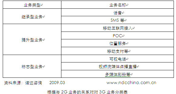 根據(jù)用戶對3G業(yè)務(wù)的體驗(yàn),其與2G業(yè)務(wù)的關(guān)系可以分為:繼承型業(yè)務(wù)(話音、SMS等)、提升型業(yè)務(wù)(移動(dòng)互聯(lián)網(wǎng)接入、POC、位置服務(wù)、移動(dòng)支付、整首歌曲下載等)、標(biāo)志型業(yè)務(wù)(可視電話、視頻流媒體點(diǎn)播直播、多媒體彩鈴、視頻會(huì)議等)