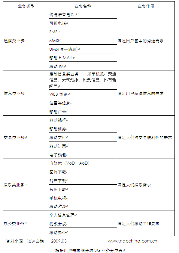 從個(gè)體用戶橫向需求角度對業(yè)務(wù)進(jìn)行劃分,3G業(yè)務(wù)可以分為五大類,主要包括五類通訊類業(yè)務(wù)、信息類業(yè)務(wù)、交易類業(yè)務(wù)、娛樂類業(yè)務(wù)、辦公類業(yè)務(wù)。諾達(dá)咨詢《3G發(fā)展報(bào)告系列——全球3G業(yè)務(wù)與運(yùn)營市場發(fā)展研究報(bào)告2009》認(rèn)為該種一方面考慮了企業(yè)業(yè)務(wù)發(fā)展相近性和規(guī)模效應(yīng),另一方面考慮的用戶的不同需求特性,把一個(gè)用戶多種需求分割開來,以實(shí)現(xiàn)低成本的使需求得以滿足。是一種傳統(tǒng)的業(yè)務(wù)分類方法,適合傳統(tǒng)技術(shù)條件下的合作分工的市場及產(chǎn)業(yè)環(huán)境。這種分類方法利于業(yè)務(wù)的設(shè)計(jì)及推出。