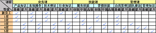 要實現(xiàn)分層培訓管理,除了有適合的培訓體系架構,更重要的還要有一個比較完善的培訓課程體系。我們假設將這個呼叫中心分為5個服務等級,那么在課程的設置上,我們就可以按照下表所示的方式來進行安排。