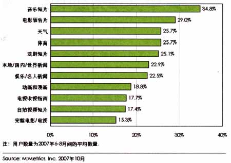 M:Metrics針對(duì)美國(guó)手機(jī)用戶的研究數(shù)據(jù)顯示,美國(guó)手機(jī)用戶在訂閱手機(jī)電視內(nèi)容時(shí)偏愛(ài)娛樂(lè)類的內(nèi)容,其中音樂(lè)短片、電影預(yù)告片是用戶需求最大的手機(jī)電視內(nèi)容,另外受到歡迎的是與生活相關(guān)的內(nèi)容及新聞內(nèi)容。