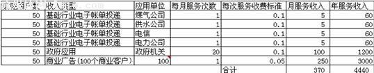 那么如果一家運營商已經設計出了符合市場需求的業(yè)務模式,未來的盈利前景將會怎樣呢?不妨讓我們模擬分析一下。假設一個運營商擁有50萬左右的城市家庭用戶。在基礎行業(yè)領域,每月可以幫助煤氣、供水、電信和電力公司各發(fā)送1次賬單;在商業(yè)客戶方面,擁有百家左右的合作伙伴,每月每家合作伙伴發(fā)送1條短信廣告;在政府機關領域,粗略估算政府機關每月總計使用20次左右;每個家庭用戶則每月收到電信短信約125條。假設運營商的服務資費中,除了商業(yè)廣告為0.05元/條外,均為0.1元/條。那么,盈利情況又該怎樣呢?