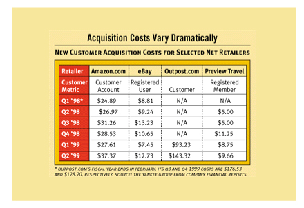 上世紀(jì)90年代末期DOT.COM就遭遇了這一嚴(yán)峻問(wèn)題。70% - 80%的客戶在沒(méi)有完成采購(gòu)之前就棄網(wǎng)站而去。對(duì)于許多人來(lái)說(shuō)這被認(rèn)為是一個(gè)“行業(yè)基準(zhǔn)”,屬于可接受水平,但也有些人開始尋找解決方案。整個(gè)行業(yè)開始注意到分析家們的忠告:這一水平的放棄率是不被允許的。下面這張由Yankee集團(tuán)在2000年發(fā)布的表格向我們展示了電子商務(wù)企業(yè)客戶獲取成本螺旋形盤升的過(guò)程。