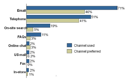 正是基于這一點(diǎn)供應(yīng)商們紛紛加入PeopleSupport的陣營(yíng),并且在這之后不久統(tǒng)一的排隊(duì)技術(shù)就問(wèn)世了,更在之后發(fā)展成全面集成的聯(lián)絡(luò)中心解決方案和eCRM套件。這些系統(tǒng)允許聯(lián)絡(luò)中心將電話流與交談、電子郵件、郵寄信件和傳真混合起來(lái),現(xiàn)在,SMS也來(lái)了。Forrester調(diào)研機(jī)構(gòu)2005年進(jìn)行了一個(gè)調(diào)研,意在檢測(cè)客戶偏愛的聯(lián)絡(luò)渠道有哪些以及他們實(shí)際使用的渠道又是哪些。該調(diào)研貫穿全美所有類型的企業(yè)(并不局限于電子零售商或DOT.COM們)