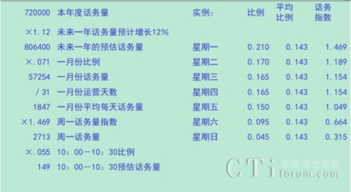 在上圖所示的比例分解過程中,我們假設(shè)去年的總來電量為720000個(gè)。在此基礎(chǔ)上,根據(jù)市場、銷售預(yù)測以及過去幾年歷史數(shù)據(jù)增長趨勢等數(shù)據(jù)測算出未來一年的話務(wù)量預(yù)計(jì)增長12%。這樣我們就得到了預(yù)計(jì)未來一年的總來電量為806400個(gè)。根據(jù)歷史數(shù)據(jù)的測算分析,一月份的來電量通常占全年總來電量的7.1%,因此明年一月份的來電量預(yù)計(jì)為57254個(gè)。由于呼叫中心是7X24小時(shí)運(yùn)營的,所以一月份平均每天的來電量為57254/31=1847個(gè)。由于大多數(shù)呼叫中心的來電量規(guī)律是以一周為周期循環(huán)波動(dòng)的,因此我們接下來要測算四個(gè)(或五個(gè))周一的話務(wù)指數(shù),以覆蓋四個(gè)或五個(gè)周一的來電量情況。我們用周一來電量占全周來電量的相對比例除以其七分之一的絕對比例,得出周一的來電量指數(shù)為1.469,也就是說,周一的來電量是相對較多的,相當(dāng)于一周日平均來電量的約147%。由此我們得出周一話務(wù)量為2713個(gè)。然后我們再根據(jù)由歷史數(shù)據(jù)測算出的周一一天中48個(gè)半小時(shí)時(shí)段占全天來電量的比例測算出周一上午10:00-10:30的來電量為149個(gè)。剩下的周二至周日都可以采用同樣的方法來推算預(yù)測。