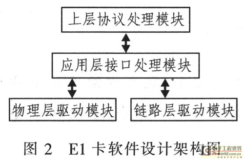 E1采集卡軟件設(shè)計架構(gòu)主要由鏈路層驅(qū)動模塊、物理層驅(qū)動模塊、應(yīng)用層接口處理模塊和上層協(xié)議處理模塊組成,如圖2所示。驅(qū)動程序是數(shù)據(jù)采集卡的基礎(chǔ),它負責E1接口數(shù)據(jù)采集和數(shù)據(jù)重組,并通過共享內(nèi)存與PC機實現(xiàn)數(shù)據(jù)交互,以及控制指令動作和硬件狀態(tài)報告等。