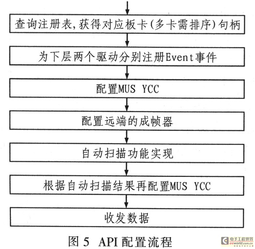 由于E1數(shù)據(jù)采集卡的MUSYCC控制器是PCI多功能設(shè)備,所以應(yīng)用程序應(yīng)當合理調(diào)整兩個功能驅(qū)動程序的控制順序,實現(xiàn)E1數(shù)據(jù)的正常采集。其E1卡應(yīng)用程序(API)的配置流程如圖5所示。