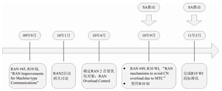 在2010年9月的RAN #49次全會上,在SA的推動下,RAN全會決定成立一個關(guān)于MTC的新的WI,用來解決避免大量MTC設(shè)備接入導(dǎo)致的核心網(wǎng)過載問題。2011年3月份,RAN2完成了此WI并在RAN全會上通過。圖4所示的是3GPP MTC R10標(biāo)準(zhǔn)化項目進(jìn)程情況。