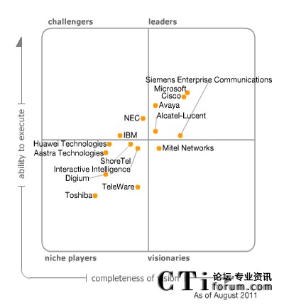 2011年統(tǒng)一通信魔力象限“領(lǐng)導(dǎo)者”象限包括AVAYA公司、阿爾卡特朗訊公司、思科公司、微軟和西門子企業(yè)通信。微軟是全面的領(lǐng)導(dǎo)者,思科公司與它接近。 NEC公司和IBM公司位于“挑戰(zhàn)者”象限,只有Mitel Networks公司位于“富有遠(yuǎn)見(jiàn)者”象限。七個(gè)其他的公司位于“特定領(lǐng)域者”象限:AASTRA技術(shù)公司、Digium公司、華為技術(shù)公司、Interactive Intelligence公司、ShoreTel公司、TeleWare公司和東芝公司。