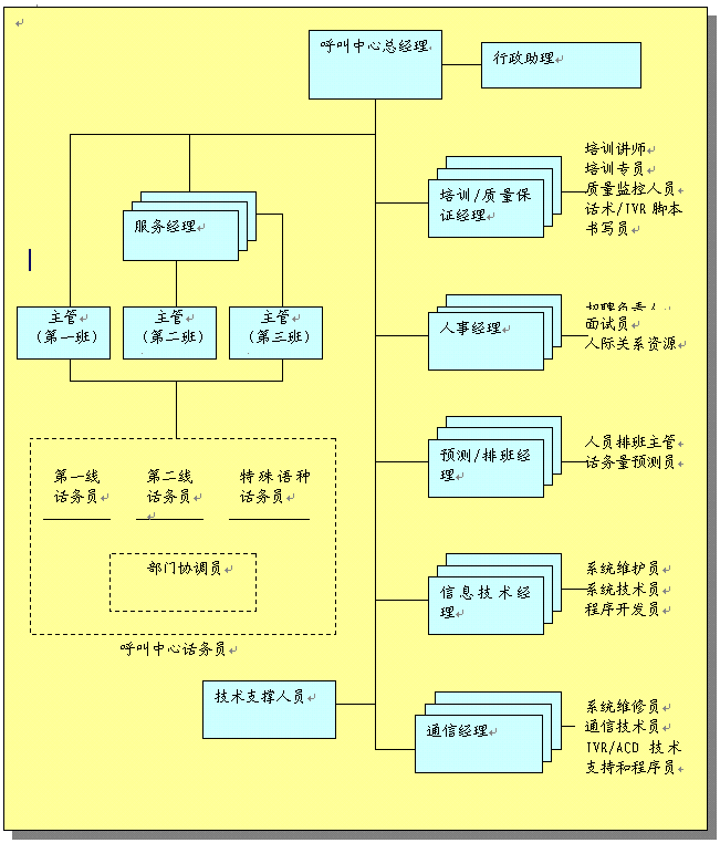 呼叫中心組織結(jié)構(gòu)概述了中心的任務(wù)和職責(zé)。對(duì)組織進(jìn)行了統(tǒng)籌安排以便中心能有效達(dá)到工作目標(biāo),組織安排主要有: