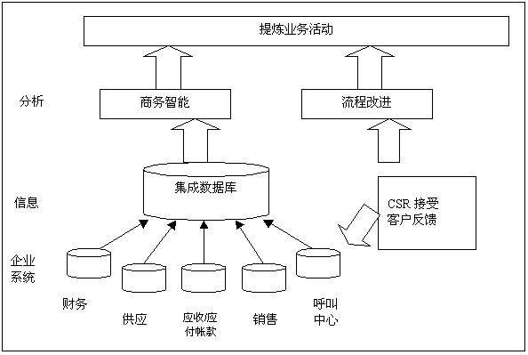 分析型CRM,也著稱為“后臺(tái)”或“戰(zhàn)術(shù)”CRM。用來分析理解發(fā)生在前臺(tái)的客戶活動(dòng)。分析型CRM需要技術(shù)(編譯和處理大量的客戶數(shù)據(jù),以便于分析)和新的業(yè)務(wù)流程(提煉面向客戶的業(yè)務(wù),以提高忠誠度和利潤率)。在分析師和業(yè)界專家的推動(dòng)下,如今大多數(shù)CRM供應(yīng)商,或者創(chuàng)造分析型CRM能力,或者與商務(wù)智能(BI)供應(yīng)商合伙,合作分析他們的數(shù)據(jù)。圖2表明了數(shù)據(jù)和流程如何用來提煉業(yè)務(wù)活動(dòng)。