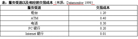 表:服務渠道以及相應的交易成本(來源:Datamonitor 1999)