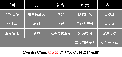 GreaterChinaCRM提出了一組量度標(biāo)準(五個范圍共17項),不僅覆蓋了軟件/技術(shù)方面的回報,也綜合包括了策略,人,流程,技術(shù)和客戶。這些量度標(biāo)準告訴我們應(yīng)當(dāng)如何看待和評估CRM的實施。讓我們來看一下: