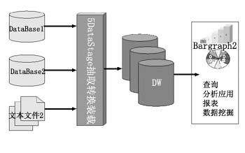 由圖1可以看出DataStage既可以應(yīng)用于多個(gè)數(shù)據(jù)庫(kù)數(shù)據(jù)的抽取轉(zhuǎn)換,也可以對(duì)普通的文本文件、HTML文件進(jìn)行抽取轉(zhuǎn)換,然后將轉(zhuǎn)換后的數(shù)據(jù)直接裝載到數(shù)據(jù)倉(cāng)庫(kù)中或產(chǎn)生新的普通文本文件等,便于客戶以后對(duì)數(shù)據(jù)進(jìn)行查詢、分析、制作各種報(bào)表,并且進(jìn)行數(shù)據(jù)挖掘。