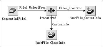 客戶信息數(shù)據(jù)庫(kù)中的各表以客戶編碼為關(guān)鍵字進(jìn)行關(guān)聯(lián),客戶編碼是由客戶的證件號(hào)碼經(jīng)過(guò)專門(mén)的算法計(jì)算產(chǎn)生的唯一客戶標(biāo)識(shí)。根據(jù)各個(gè)系統(tǒng)中客戶數(shù)據(jù)與新系統(tǒng)客戶信息的對(duì)照關(guān)系我們?cè)O(shè)計(jì)數(shù)據(jù)抽取轉(zhuǎn)換的程序,如圖4所示是一個(gè)DataStage的Job。