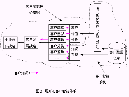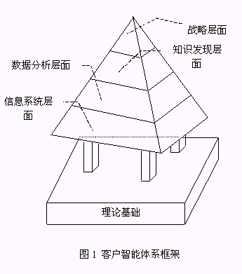 客戶智能系統(tǒng)(CI System)是本文提出的實現(xiàn)客戶智能的系統(tǒng)平臺。它包括了客戶智能體系中的信息系統(tǒng)層面、數(shù)據(jù)分析層面、知識發(fā)現(xiàn)層面,是基于客戶智能理論的可操作的系統(tǒng)框架。因此,客戶智能體系也可以簡單地用客戶智能基礎理論和基于客戶智能理論的客戶智能系統(tǒng)兩個邏輯層面表示(圖2);诳蛻糁悄艿腃RM系統(tǒng)是本文描述的客戶智能系統(tǒng)中的一種。