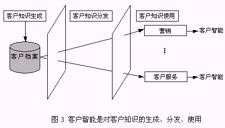 客戶知識是人們通過實踐認識到的、與客戶有關的規(guī)律性,而客戶智能是獲得客戶知識并使用客戶知識求解問題的能力。客戶智能是對企業(yè)戰(zhàn)略決策真正有價值的事物和行動?蛻糁悄懿粌H包括了客戶知識的生成,而且更強調(diào)了客戶知識在企業(yè)中的分發(fā)、使用,直到產(chǎn)生客戶智能。所以,客戶智能是對客戶知識的生成、分發(fā)和使用(圖3)。