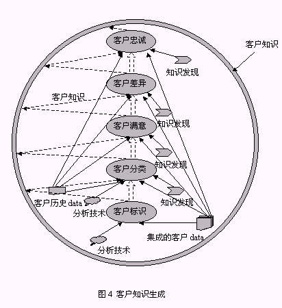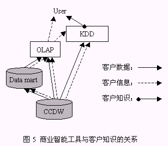從以上構成系統(tǒng)的三個組件的介紹中同時可以找到對以下兩個問題的答案:1、客戶數(shù)據(jù)、客戶信息、客戶知識之間的區(qū)別(圖5):由來自于事務系統(tǒng),如ERP、SFA等的源數(shù)據(jù)經(jīng)整理后放入CCDW或數(shù)據(jù)集市,這一過程處理的對象稱為客戶數(shù)據(jù);OLAP為決策人員提供了展示有意義的客戶數(shù)據(jù)的機制,這種有意義的客戶數(shù)據(jù)稱之為客戶信息;客戶數(shù)據(jù)和客戶信息均可以通過KDD技術的運用,提升為對決策有價值的客戶知識。2、客戶知識生成的途徑:從對第一個問題的解答中可以知道,客戶知識從KDD作用的對象來看有兩種途徑:KDD作用于客戶數(shù)據(jù)、KDD作用于客戶信息,總之,客戶知識生成是依賴于KDD過程的復雜的過程。