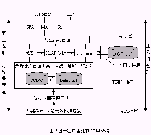 圖6是本文給出的以客戶智能為核心的I-CRM系統(tǒng)架構。從數(shù)據(jù)源層來的客戶數(shù)據(jù)經(jīng)過ETL(抽取、轉換、裝載)、清洗后以數(shù)據(jù)存儲層的CCDW或數(shù)據(jù)集市的形式存儲。應用支持層是提供了報表查詢、OLAP、知識發(fā)現(xiàn)分析決策工具,作用于客戶數(shù)據(jù),該過程產(chǎn)生的有價值的客戶知識存儲于動態(tài)知識庫中;訉犹峁┝薎-CRM利用客戶知識從而有效實施其功能的場所。該架構具有以下特點: