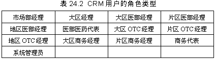 另外,對CRM系統(tǒng)的用戶也進行了明確的定義,按照工作性質(zhì),以及本著能夠快速高效地共享信息,提高銷售能力和工作效率的原則,確定表24.2所示的CRM用戶的角色類型。