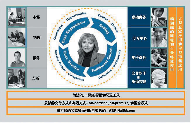 mySAP CRM不僅包含了企業(yè)市場營銷、銷售、服務(wù)、分析等功能,還通過渠道伙伴、現(xiàn)場和移動商務(wù)、交互中心、電子商務(wù)等各種交互渠道形成完整的閉環(huán)式設(shè)計的解決方案。在提供深入的行業(yè)應(yīng)用和傳統(tǒng)的部署方式的同時,mySAP CRM 還提供按需租用的部署方式。