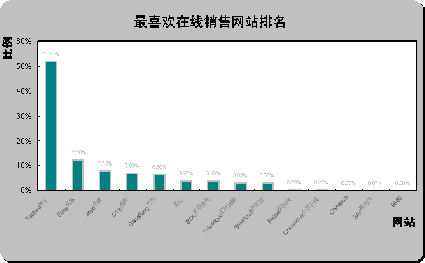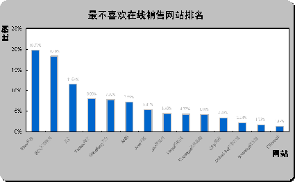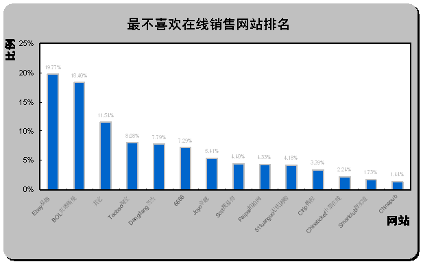 易趣中國和貝塔斯曼最不受歡迎。從最不喜歡在線銷售網站排名(如上圖)可以看出,易趣中國eBay